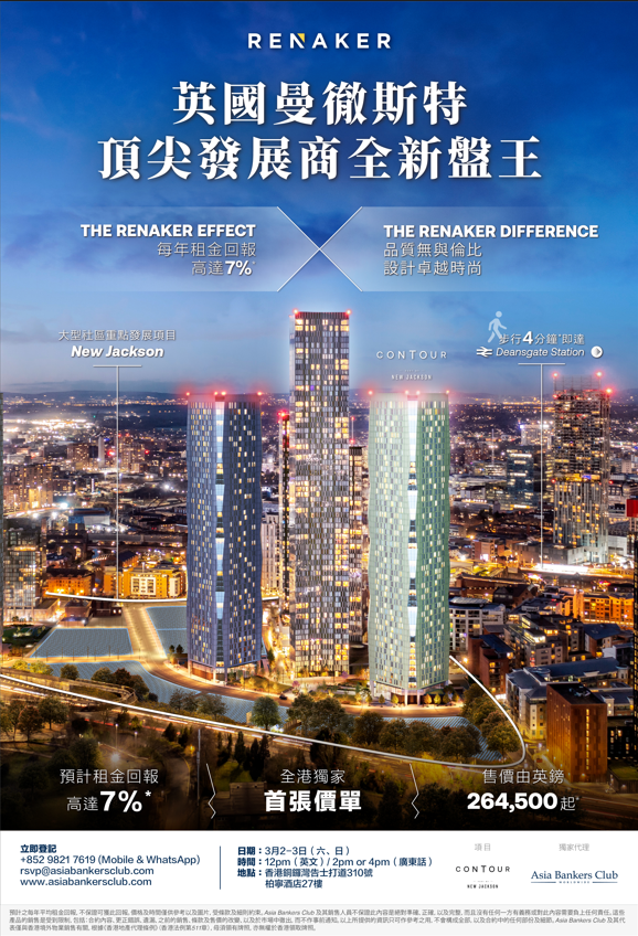 由英國曼徹斯特龍頭發展商 Renaker 推出年度盤王 Contour,樓高51層,座落於曼徹斯特 Deansgate Square 旁的 New Jackson 中。而 New Jackson 位於一個集零售、餐廳、娛樂、教育等多功能於一體的世界級摩天大樓區內。對其居民和整個城市來說都非常有吸引力,提供了一個內部和外部都擁有充足空間的市中心住宅。此外,只需步行 4分鐘* 即可到達 1站雙線 Deansgate 站及 Deansgate-Castlefield 站,便輕鬆前往市中心和更遠的地方,而核心商業區 First Street 僅需步行 3分鐘* 即可到達,讓居民可以享受其豐富的文化、休閒和商業區。這兩者為 New Jackson 的居民帶來了便利。Asia Bankers Club 榮獲香港獨家代理,取得首輪價單,售價僅 £26.4萬*起,預計租金回報高達 7%* p.a.! 出席講座更可獨享特別優惠!不要錯過探索「The Renaker Effect」的威力的機會!立即登記物業投資講座,索取第1手價單及樓盤資料。