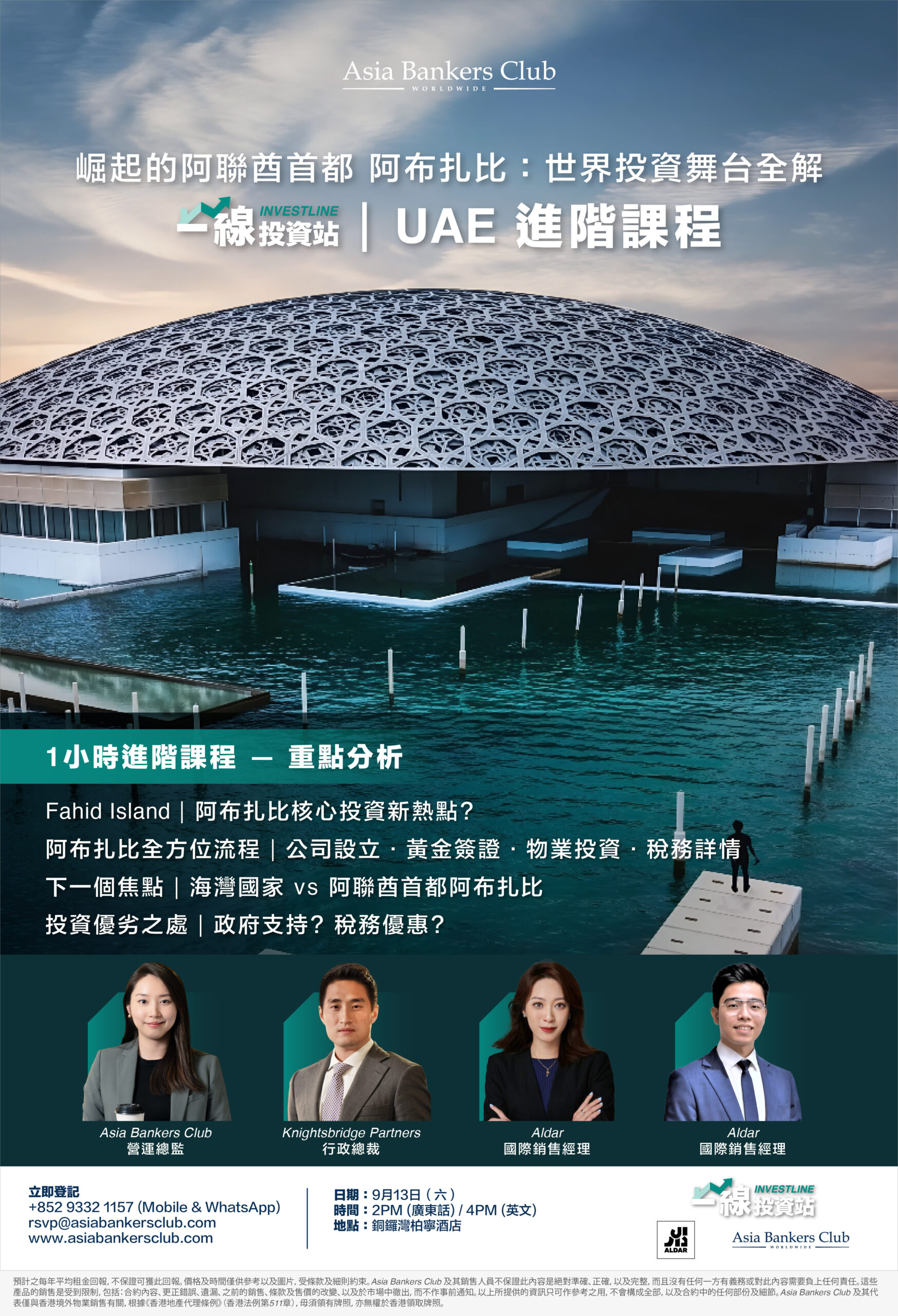在本次課程中,Agnes 將深入剖析阿聯酋房地產投資趨勢、黃金簽證申請實務策略,並清晰比較香港與阿聯酋的財富規劃差異,助您制定更具前瞻性的全球財富布局方案,做出明智決策。