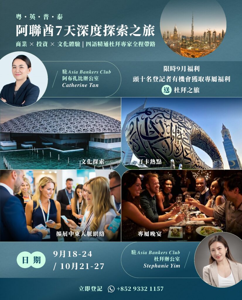 誠邀您加入我們九月在香港舉辦的專場講座,一同分析阿聯酋如何從依賴石油的經濟轉型為多元化的全球樞紐。從杜拜與阿布達比以創新為驅動的政策,到與沙烏地阿拉伯的區域競爭,本次講座將提供中東經濟格局轉變的及時洞見。我們亦將探討阿聯酋的黃金簽證、自由貿易區優勢、稅務激勵及國際投資環境——這些因素使阿聯酋成為全球資本與人才的首選地。