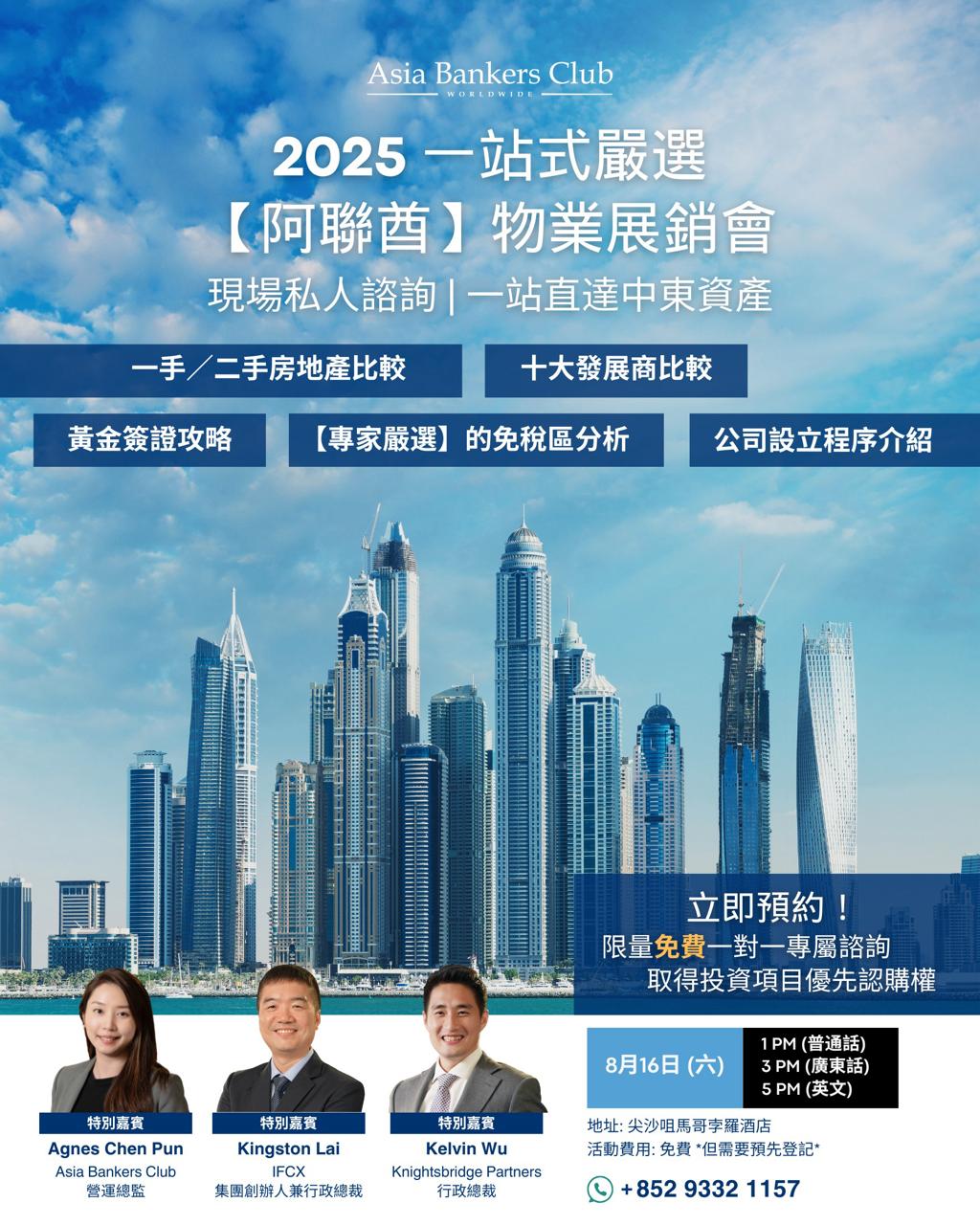 誠邀您於 8 月 16 日親臨香港,參加一場深入解析阿聯酋投資機遇的專題講座。本次活動將全面涵蓋杜拜與阿布扎比一手及二手房產的比較、頂級發展商評估與回報預測,幫助投資者掌握實用且最新的市場資訊。