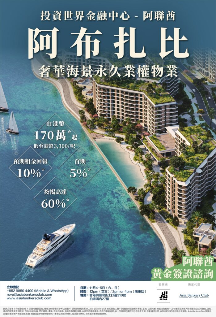 位於阿布扎比亞斯島 (Yas Island) 的奢華海景物業項目 Gardenia Bay。由港幣170萬*起,呎價低至港幣$3,300/呎,每年預期租金回報高達10%*,只需5%首期。此外,10分鐘*車程內可以抵達 Yas Island 多個熱門景點,包括法拉利世界 (Ferrari World)、海洋世界 (SeaWorld)、亞斯島沙灘(Yas Beach)、華納兄弟世界 (Warners Bros World)及F1賽車場等。20分鐘*車程內更可到達阿布扎比著名文化區域 Saadiyat Island。
