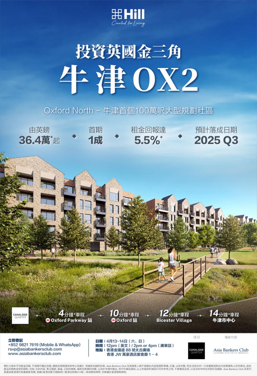 英國牛津及劍橋最大發展商 Hill 打造的 Canalside Quarter,為牛津 OX2 歷年罕有全新物業。座落於耗資 £7 億英鎊全牛津首個 100萬呎大型規劃社區 Oxford North擁有龐大潛在優質租戶。Canalside Quarter 受益於其優越的地理位置,位於劍橋和倫敦的黃金三角之間,交通便利。未來東西鐵路 East-West Rail 開通後,可在75分鐘*內到達劍橋,現時經毗鄰的A40公路開車直達倫敦市中心只需42分鐘*。由項目開車到 Oxford Parkway 鐵路站只需4分鐘*10分鐘*到達牛津 Oxford 鐵路站。而開車前往牛津市中心只需14分鐘*、開車前往港人最愛購物熱點 Bicester Village 只需12分鐘*Asia Bankers Club 榮獲香港獨家代理,取得首輪價單,售價僅 £364,950*起,只需1成*首期,預計租金回報高達 5.5%* p.a.! 出席講座更可獨享特別優惠!不要錯過投資金三角牛津物業的機會!立即登記物業投資講座,索取第1手價單及樓盤資料。