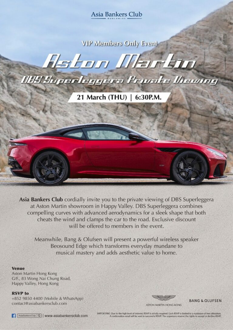 Asia Bankers Club partnered with Aston Martin, Bang & Olufsen and Sonata Club which brought an unforgettable evening to our selected VIP members. A private viewing on the Aston Martin DBS Superleggera and our members are the exclusive one to experience the comfortable inner design. Meanwhile, Bang & Olufsen presented their powerful and luxury audio equipment with the classic vinyl turntable from Sonata Club, members enjoyed a really stunning and amazing evening with nice wine and canapes treated.