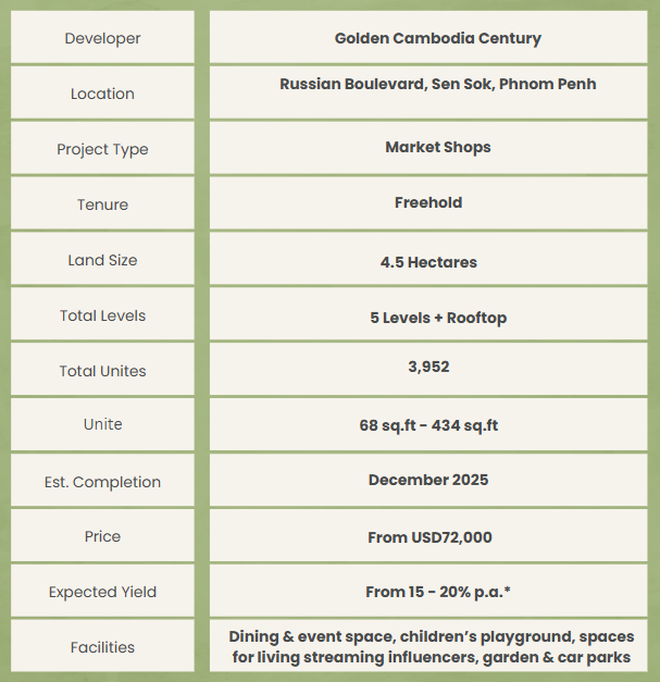 Markets are a vital part of Cambodia, embodying the essence of the community. This is a fantastic investment opportunity, as you can purchase a shop in GC Orussey Market for rental purposes, capitalizing on the high demand and rental yields up to 15 – 20% p.a.*.