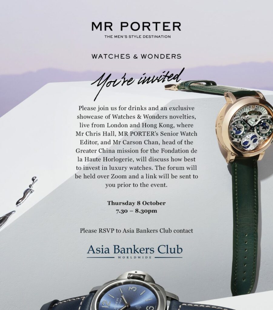 In a very special collaboration, MR PORTER co-hosted a virtual event for up to 10 of its top EIPs with Asia Bankers Club. It was an exquisite showcase of the latest timepieces released at Watchest & Wonders. Guests also received a cocktail kit from Hennessy and £150 GBP of credit with a letter introduction letter to the Personal Shopper and service.
