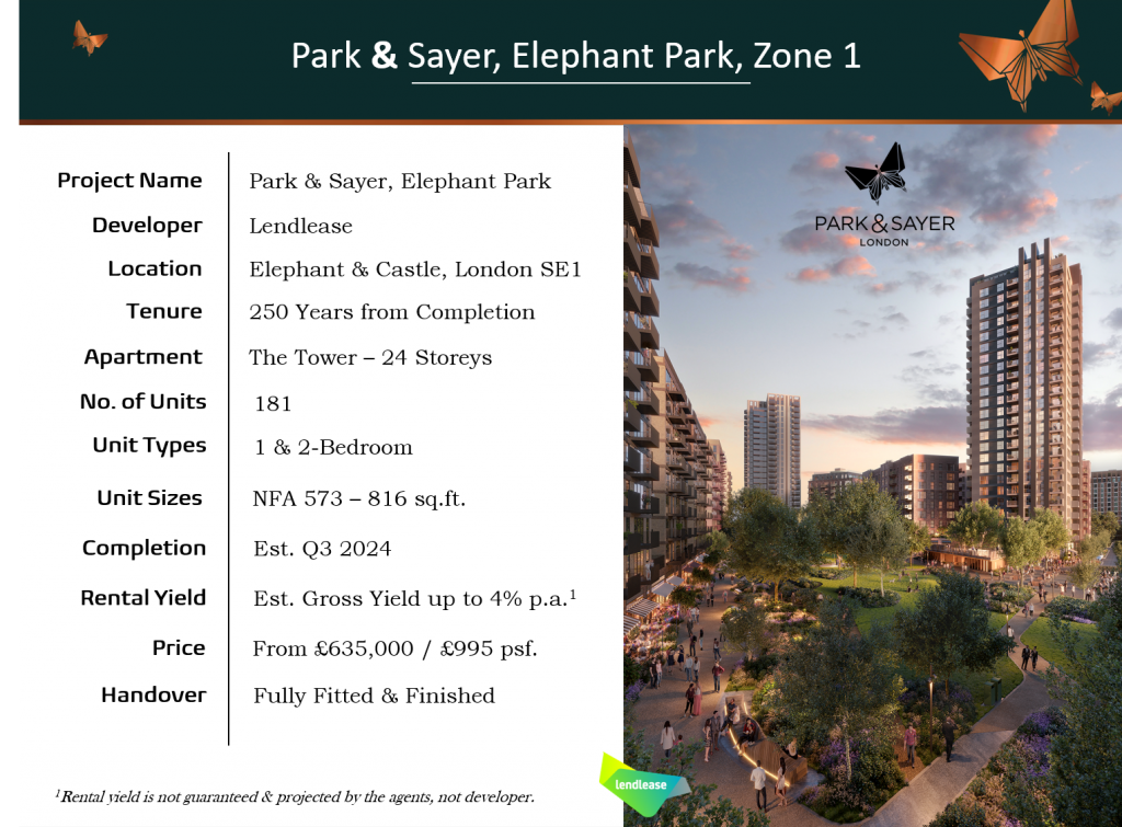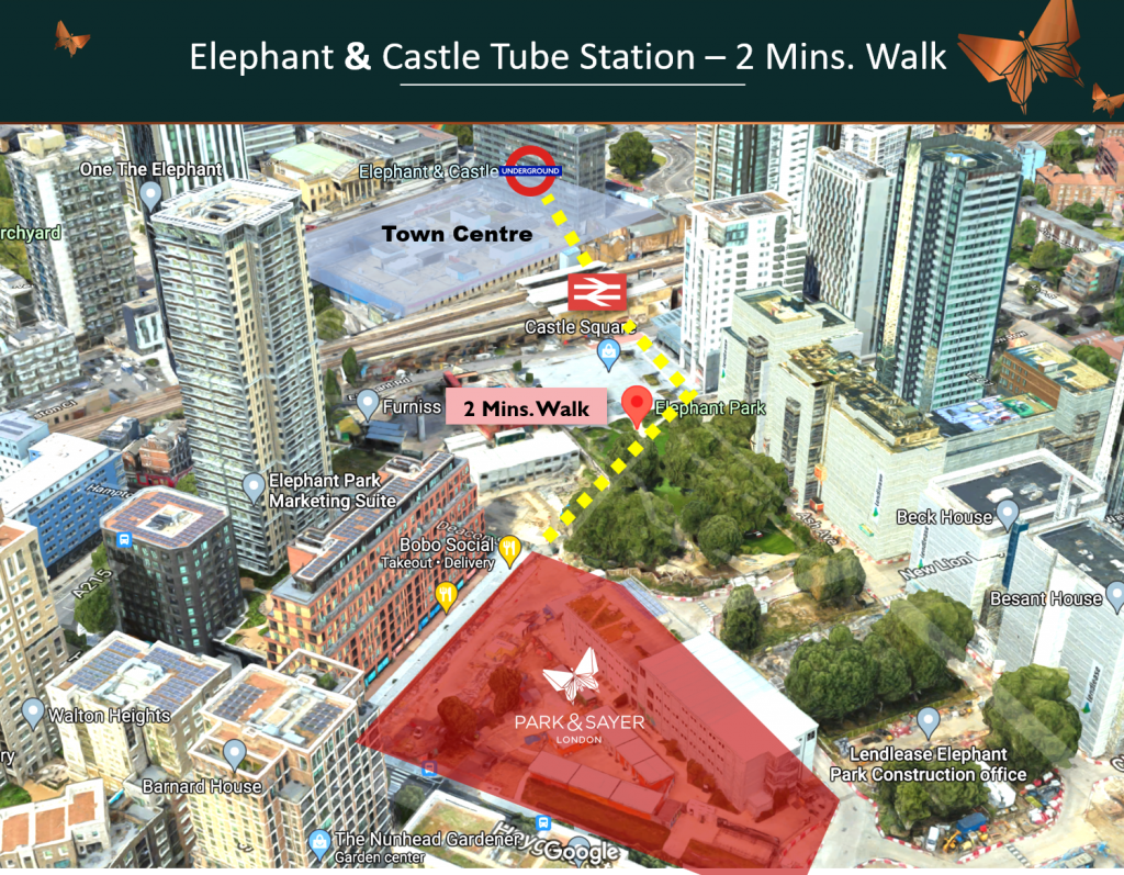 Urbanisation, greenery and city development do not usually go hand-in-hand – with Park & Sayer being one of the most remarkable exceptions. Situated within Elephant Park, a £2.5B regeneration project held by reputable developer – Lendlease and the Southwark Council, Park & Sayer is at the heart of an energised community where a new town centre is curated with an abundance of upscale boutiques, galleries and markets. With Elephant & Castle being the nearest tube station, Park & Sayer’s location is the epitome of convenience – reaching the tube station in 2 minutes and train station in 1, the breathtaking landscape of the UK is practically at your doorsteps. Shopping and dining can be easily done at the City of London, which is a mere 10-min tube ride away. Feeling inspired and wanting some creative outlets? The contemporary cultural core of Southbank is only a short walk away, (think Tate Modern or the Royal Festival Hall). Looking for a quick weekend getaway? Cambridge or Brighton can be reached in around an hour, with trains running 24/7 transporting you to the beach or country side whenever you fancy. Enjoy the hassle-free commute and truly unparalleled connectivity.