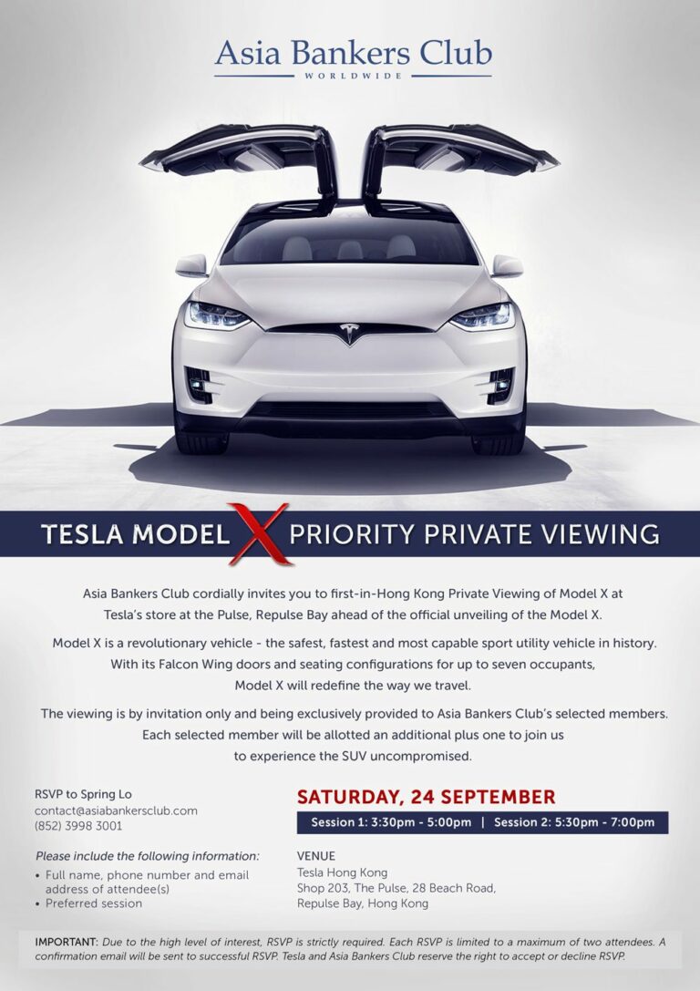 Selected members of Asia Bankers Club were invited to attend the Private Viewing of Model X at Tesla’s store at the Pulse, Repulse Bay ahead of the official unveiling of the Model X. An intimate viewing for around 20 members and their guests, Model X has impressed the crowd with its revolutionary concept, being the safest, fastest and most capable sport utility vehicle in history.