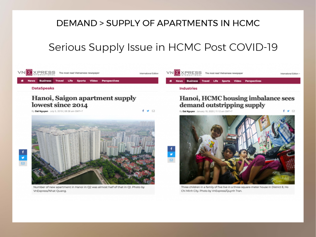 Under the adversity of COVID-19, Vietnam’s GDP still records positive growth and it is deemed to recover ahead of other South East Asia counterparts. Thanks to the China-US trade war, technology giants such as Apple, Google, Microsoft, and other foreign companies have moved to Vietnam to diversity their risks, accelerating its international status and local economic development. With the Vietnam government gradually resuming its international commercial flights, it is predicted a V-shaped rebound for Vietnam economy. Now would be the good time to invest in Vietnam for long term capital gain.