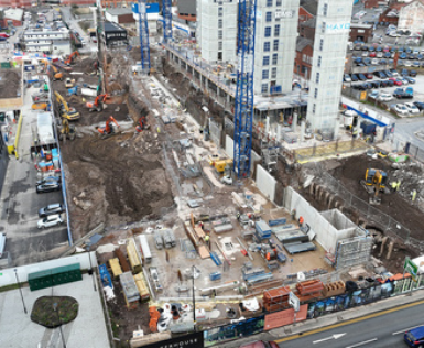- Block B- Piling complete to mid- level area. Ground level remain as storage/loading zone.